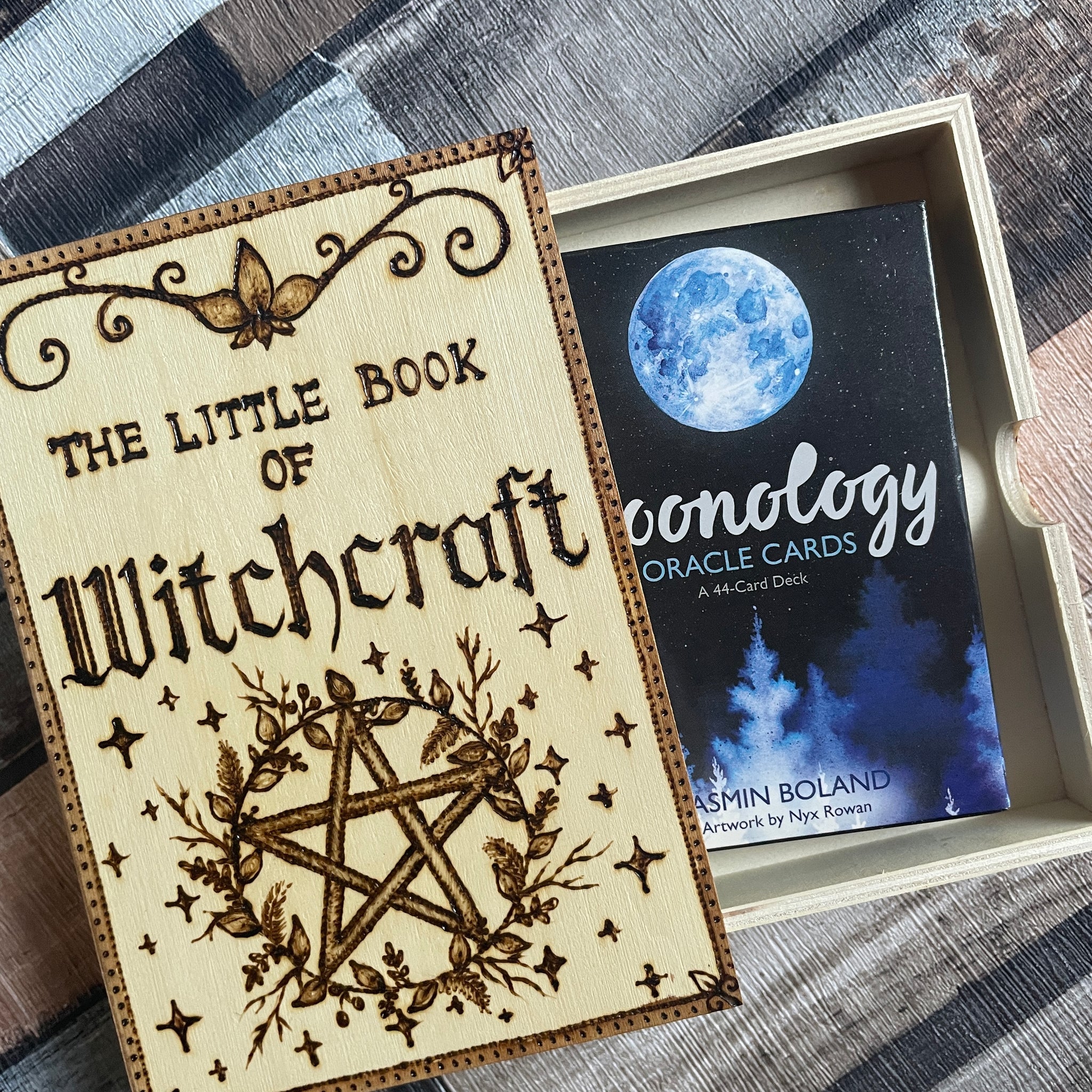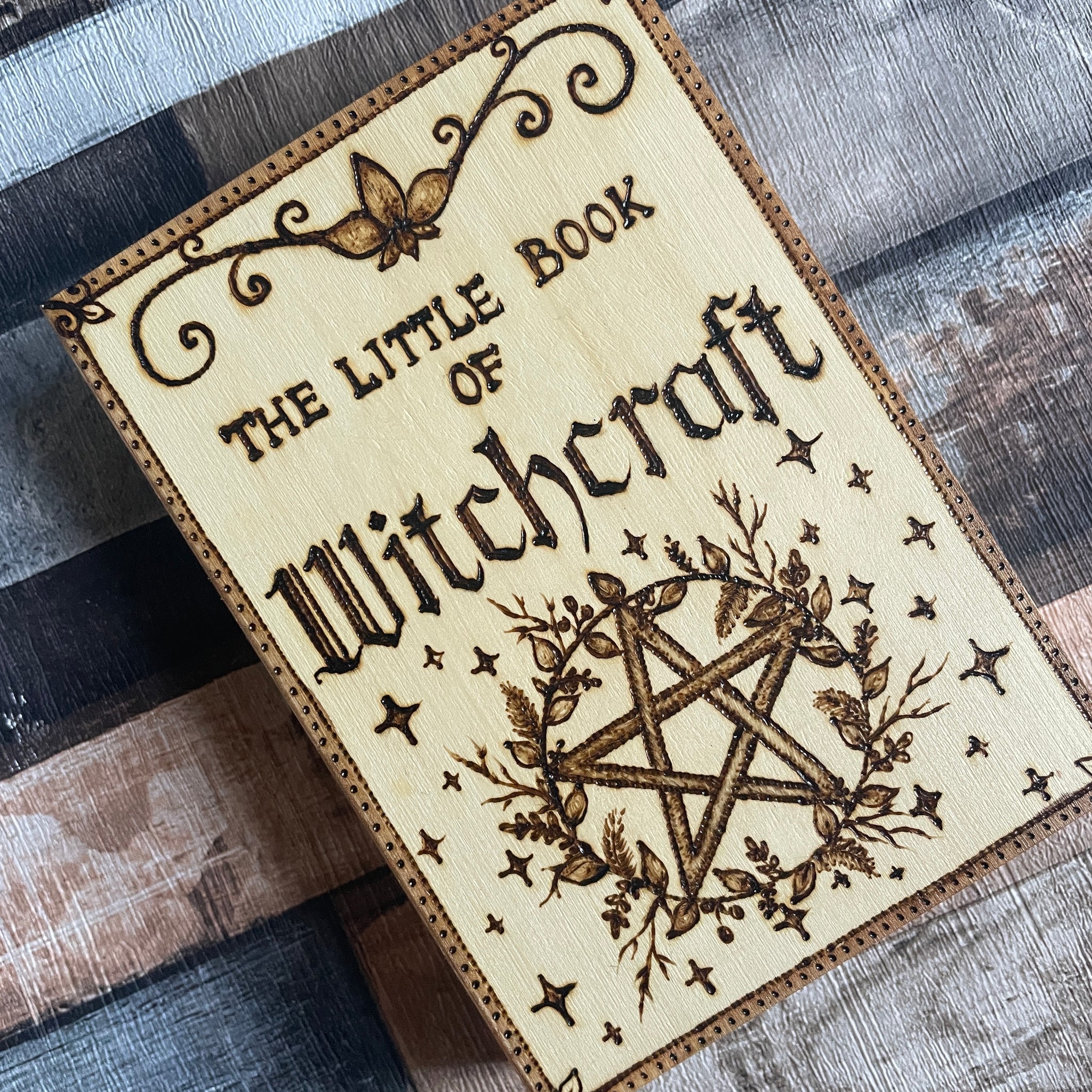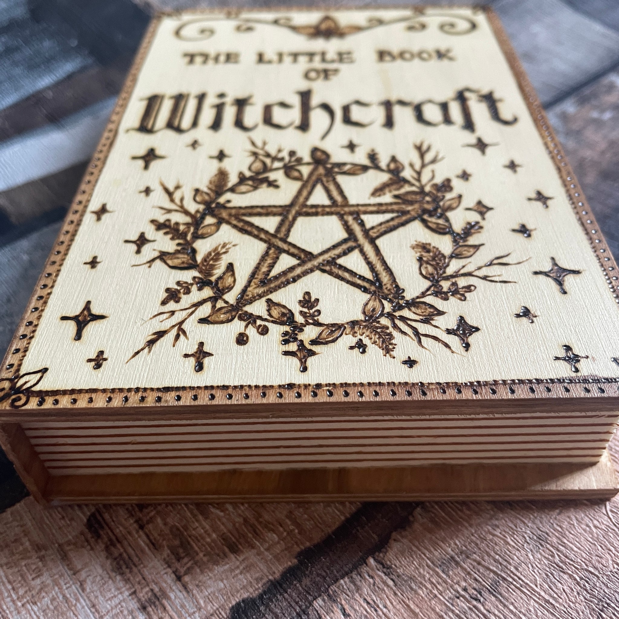 Mini wooden book box, handburned with a book cover design, featuring the title ‘’The little book of Witchcraft’. The box has a small internal compartment which slides out, with decorative edging to make it look like a book.